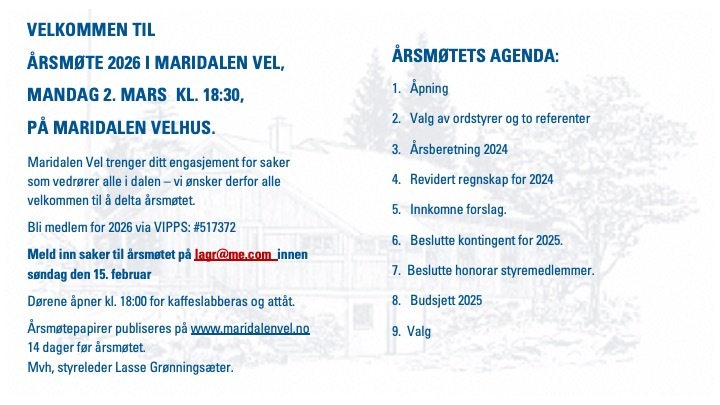 Velkommen til årsmøte i Maridalen Vel, på velhuset i Kasaveien #1, mandag den 2.mars kl. 18:30. Dørene åpner kl. 18:00 for kaffeslabberes og attåt.